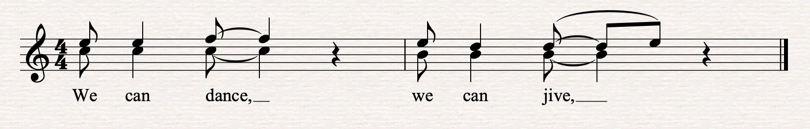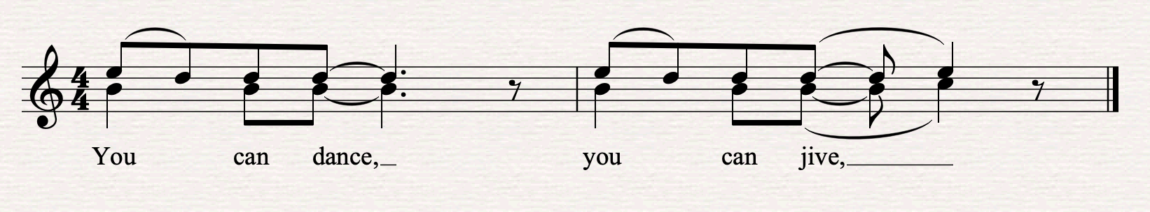 We see a number of similarities: the same basic melody, on the same pitches relative to the key (including the characteristic upwards figure on ‘jive’); the same rhythm, with the one exception of the introduction of a syncopation on ‘can’; the harmonizing vocal part on the same pitches as those in the original, with the removal of one note at the end. This is not to mention the sound of the voices.