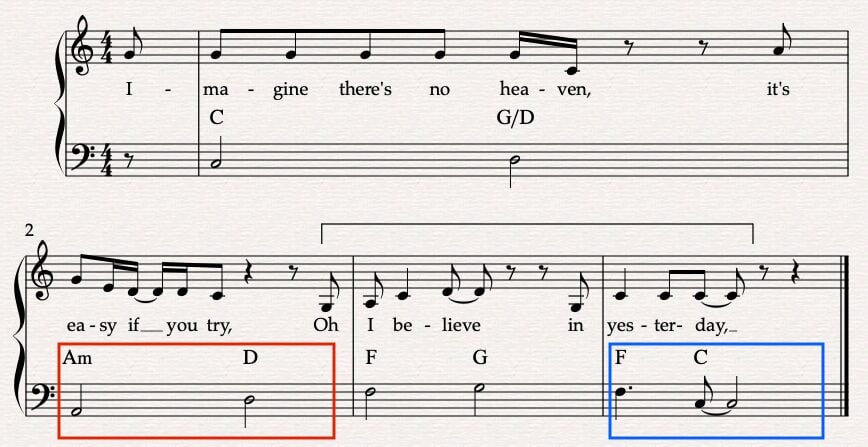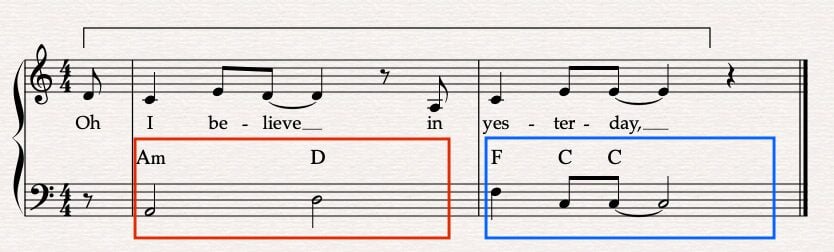 In another example, below, the rhythm in the vocal line on the words ‘Oh I believe in yesterday’ is the same as in the original (except a small alteration on ‘believe’), and characteristic chord progressions from the original are used: submediant to supertonic major (indicated in red), and a closing cadence from subdominant to tonic (indicated in blue).