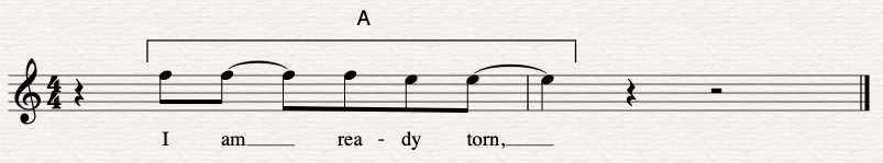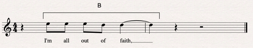 In the transcription, we can see that the pitches on ‘I’m all out of faith’ correspond to the same pitches on those words in the original (see passage marked B), and the pitches on ‘I am ready torn’ correspond to those on ‘Nothing’s fine, I’m torn’ in the original (see passage marked A).